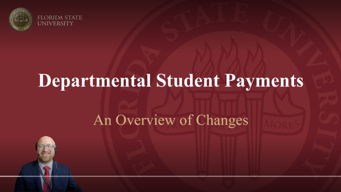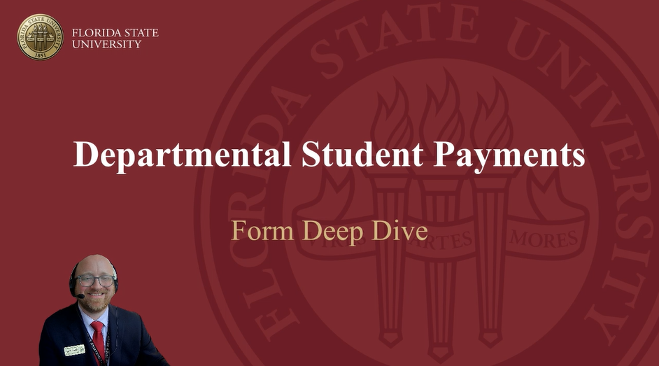 The Departmental Student Payment process is used to pay students for a number of activities --- scholarships, fellowships, direct payments (sometimes referred to as stipends), reporting non-cash awards, and many others. You can find more guidance for paying students here. We have provided a number of links, videos, and instructions below to help departments understand the process and successfully navigate this complicated activity. If you have any questions, use the contact information below to reach out to a team member directly, or email ctl-studentpayment@fsu.edu