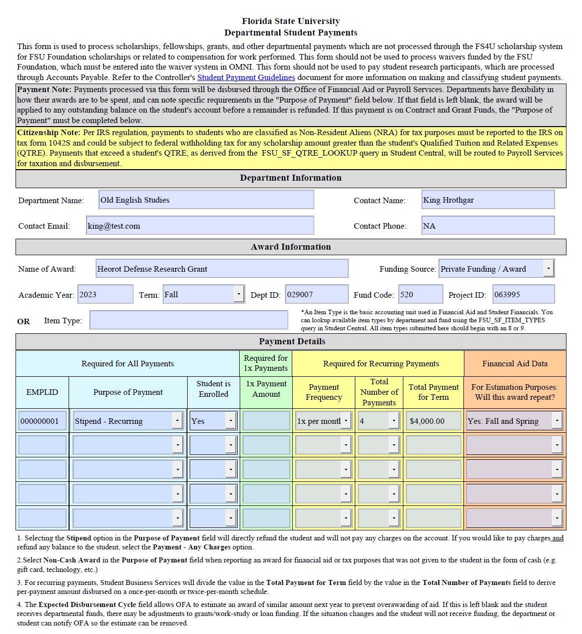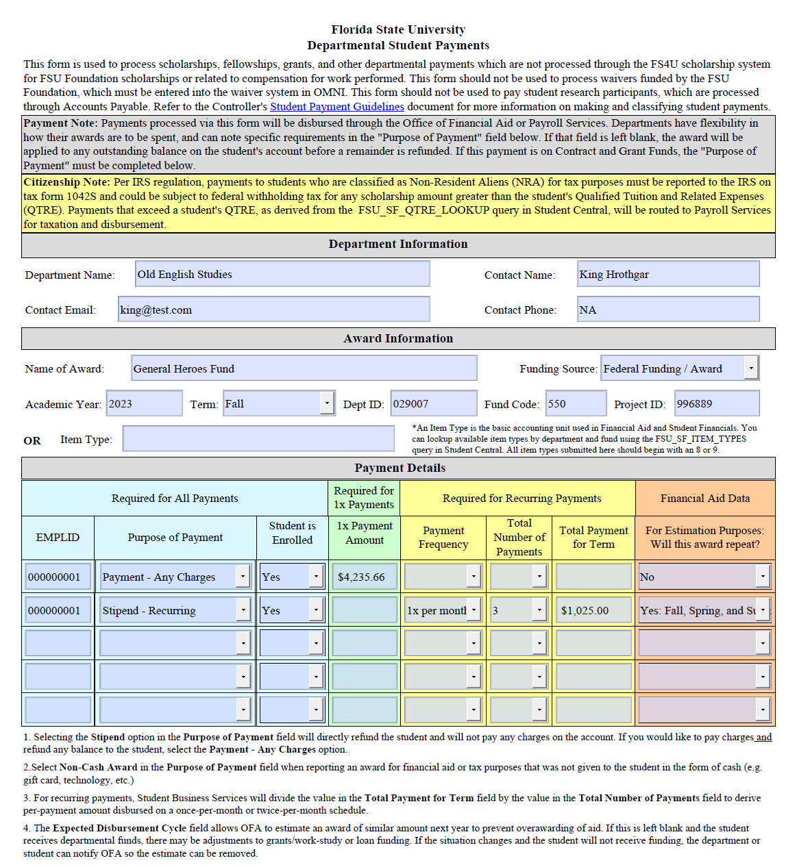 - Department Name: The name of the FSU department issuing the payment (ex: Psychology, Anthropology, Center for Academic Retention and Enhancement, etc.)